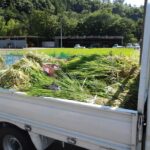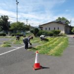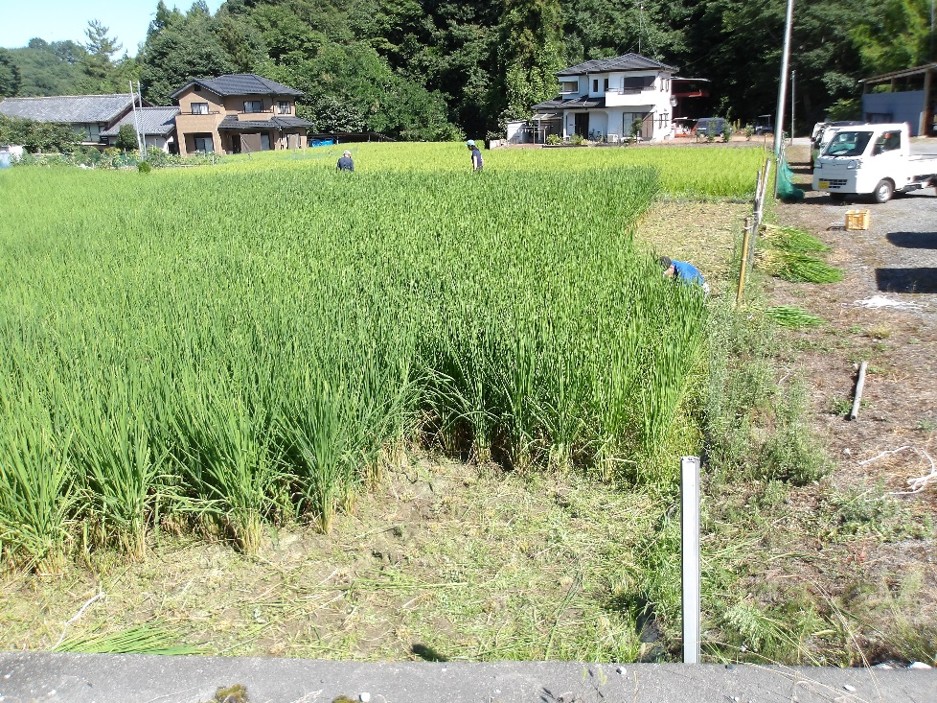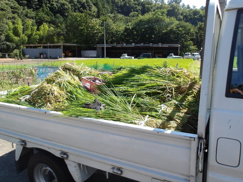 令和7年8月上中旬の晴れた日、皆野町三沢地区内の田んぼにおいて、正月飾り用の稲刈りを行いました。その後、長生荘の駐車場にて乾燥作業を行いました。