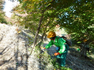 平成30年11月3日(土)、企業の森林づくりツル切作業ボランティアに、皆野町シルバー人材センターの会員と職員が参加し、美の山公園内の町有地でツル切り作業を行いました。